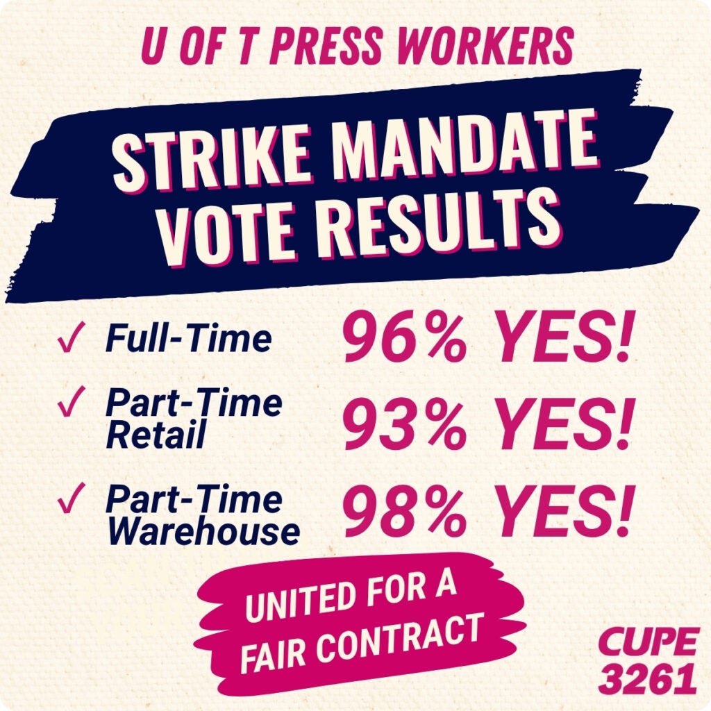 With an incredible turnout, U of T Press workers have voted 90%+ YES to authorize strike action.
